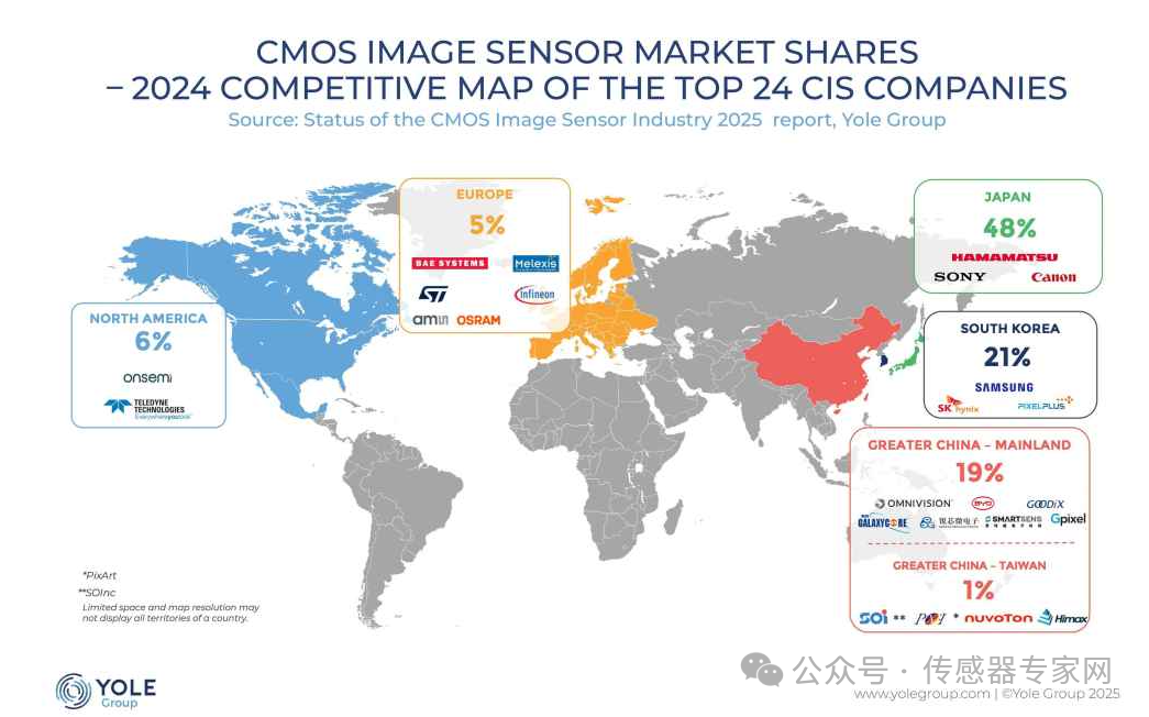 根據(jù)Yole 《Status of the CMOS Image Sensor Industry 2025》(《2025 年 CMOS 圖像傳感器行業(yè)現(xiàn)狀》)報告顯示,以豪威集團(tuán)(原韋爾股份、Omnivision)、格科微(Galaxycore)、思特威(Smartsens)、比亞迪(BYD)、長光辰芯(Gpixel)、匯頂科技(Goodix)、銳芯微為代表的中國大陸CMOS圖像傳感器產(chǎn)生,占據(jù)全球19%的市場份額。此外,中國臺灣省的原相科技、晶相科技、敦泰科技等廠商,合計占1%市場份額。