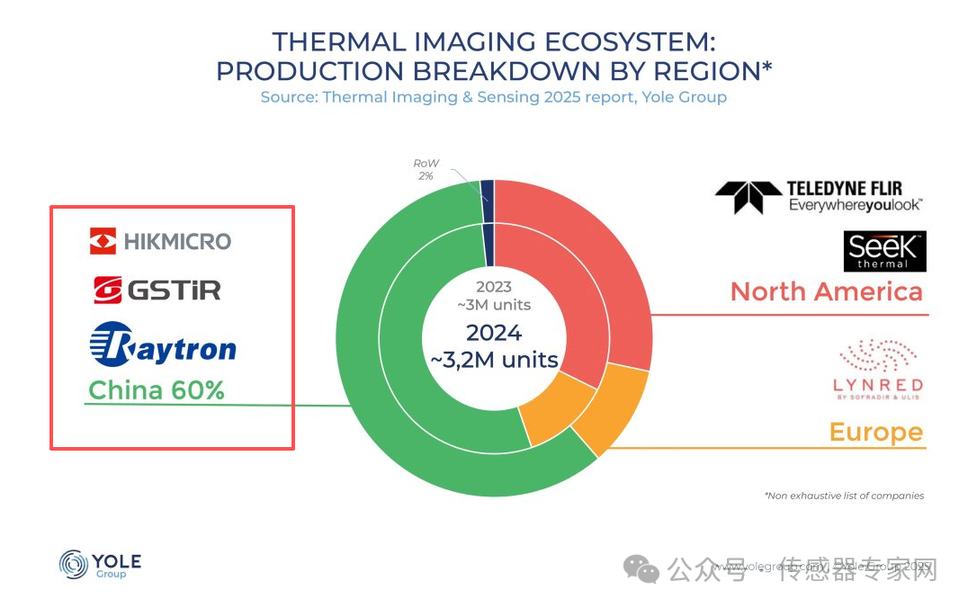 根據(jù)Yole 8月份剛剛發(fā)布的最新《Thermal Imaging and Sensing 2025》(《熱成像與傳感2025》)報告顯示,以海康微影(Hikmicro)、高德紅外(Gstir)、睿創(chuàng)微納(Raytron)為代表的中國紅外傳感公司,占據(jù)全球60%的市場份額。