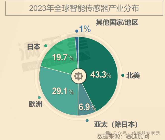 然而,在高精尖的智能傳感器市場,2023年全球智能傳感器產(chǎn)業(yè)由北美、歐洲、日本主導(dǎo),其中,北美占比最高,達(dá)43.3%,歐洲占比29.1%,日本占比19.7%,亞太地區(qū)(除日本)占比6.9%,其他國家/地區(qū)占比1%。