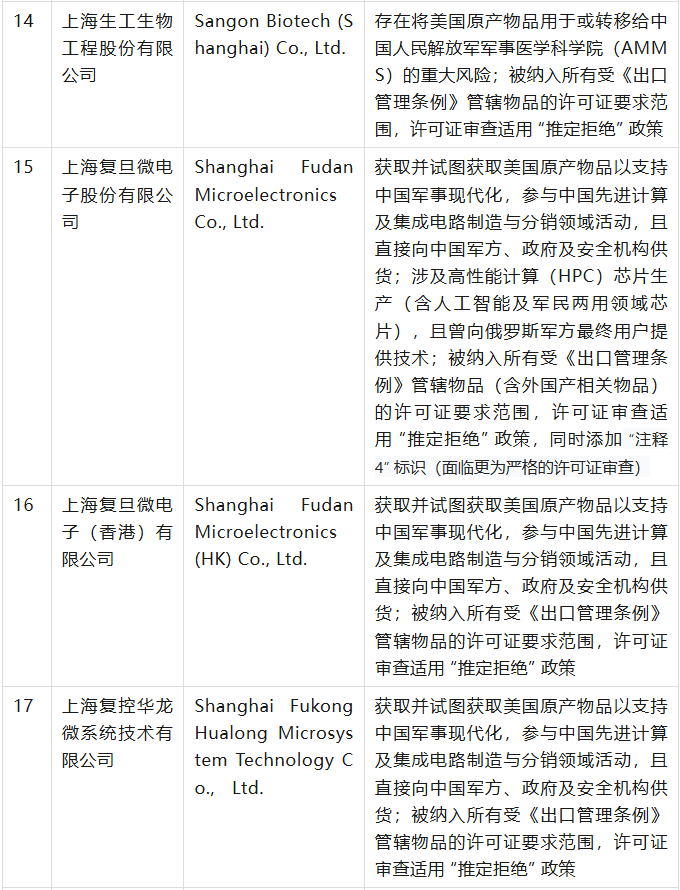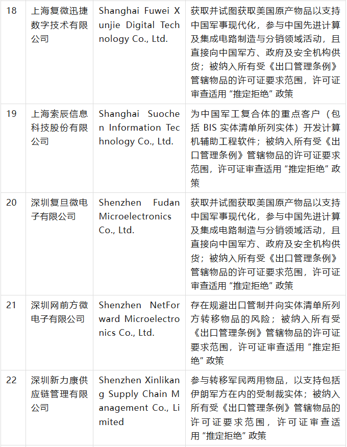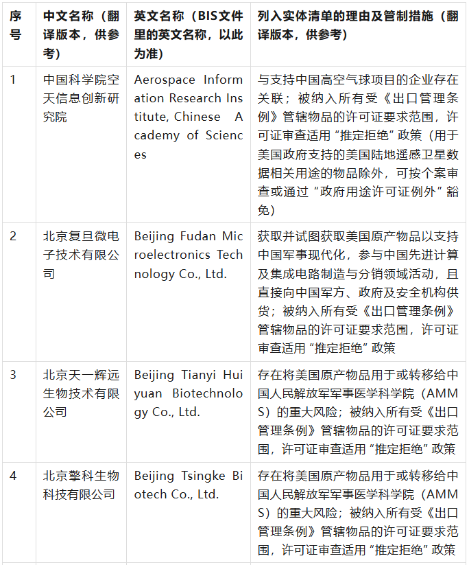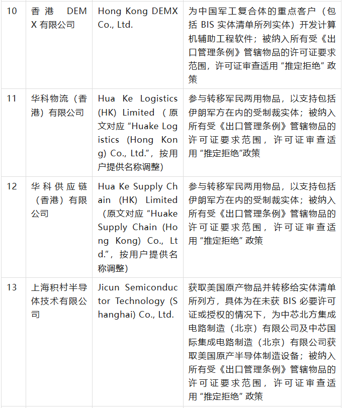 美國商務部工業(yè)與安全局(BIS)于9月12日在美國聯(lián)邦公報發(fā)布公告,通過修訂《出口管理條例》(EAR),將 32 家實體新增至實體清單,其中有23家是中國公司,具體清單、列入實體清單的理由及管制措施如下表(表中提及的列入實體清單的理由為BIS方面指認,不代表本號對該理由或相關事實的認可):
