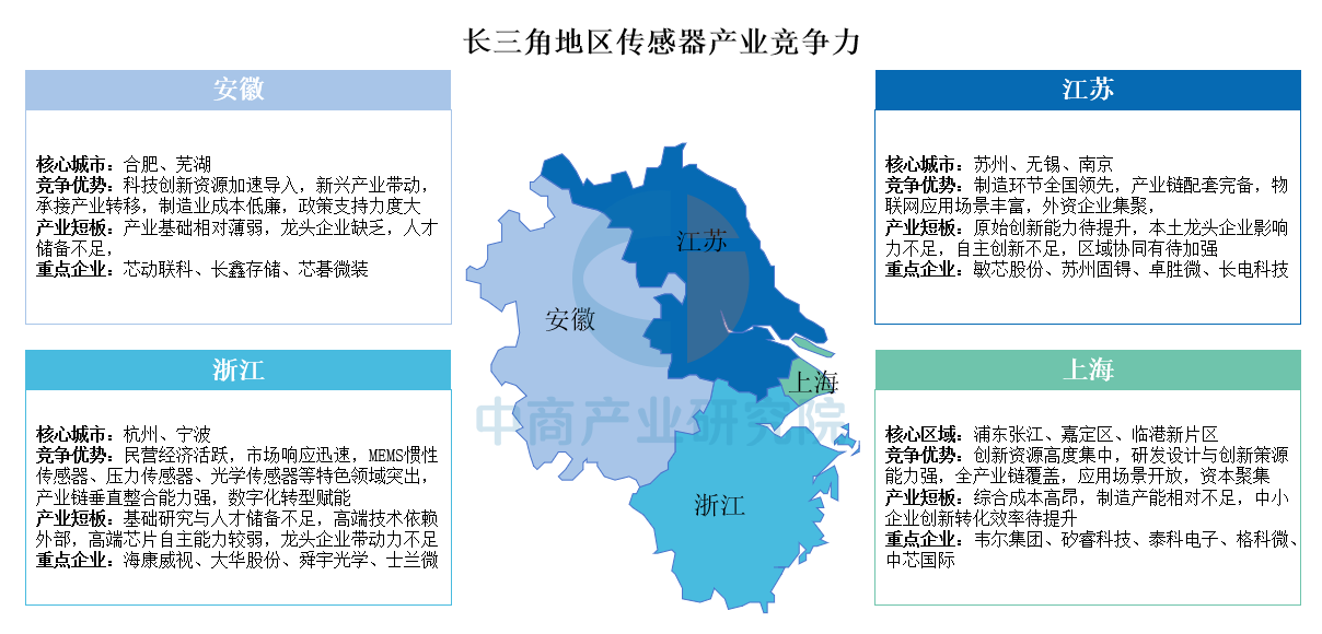 長三角地區(qū)傳感器產(chǎn)業(yè)呈現(xiàn)多層級協(xié)同發(fā)展格局:上海以研發(fā)創(chuàng)新和資本集聚見長,但面臨制造成本高企的挑戰(zhàn);浙江憑借民營經(jīng)濟(jì)活力和細(xì)分領(lǐng)域優(yōu)勢快速響應(yīng)市場,但基礎(chǔ)研究能力薄弱;江蘇強(qiáng)于制造配套和物聯(lián)網(wǎng)應(yīng)用,卻缺乏本土龍頭企業(yè)引領(lǐng);安徽依托政策紅利和成本優(yōu)勢加速產(chǎn)業(yè)承接,但產(chǎn)業(yè)基礎(chǔ)與人才儲備尚待夯實(shí)。