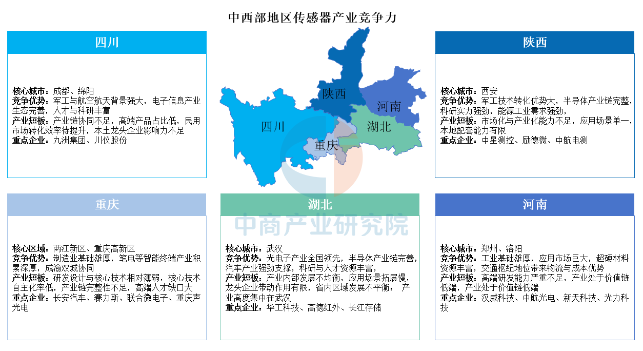 中西部地區(qū)傳感器產(chǎn)業(yè)依托傳統(tǒng)工業(yè)基礎(chǔ)與特色資源,形成多個差異化集聚區(qū)。四川依托強(qiáng)大的軍工與航空航天背景及完善的電子信息產(chǎn)業(yè)生態(tài),在傳感器領(lǐng)域具備顯著優(yōu)勢,但面臨產(chǎn)業(yè)鏈協(xié)同不足、高端產(chǎn)品占比低、民用市場轉(zhuǎn)化效率待提升及本土龍頭企業(yè)影響力較弱等問題;重慶憑借雄厚的制造業(yè)基礎(chǔ)、智能終端(如筆電)產(chǎn)業(yè)積累及成渝雙城協(xié)同優(yōu)勢出圈,但存在研發(fā)設(shè)計與核心技術(shù)薄弱、自主化率低、產(chǎn)業(yè)鏈完整性不足及高端人才缺口大等短板;湖北以光電子產(chǎn)業(yè)全國領(lǐng)先、半導(dǎo)體產(chǎn)業(yè)鏈完善及汽車產(chǎn)業(yè)強(qiáng)勁支撐為特色,但受限于產(chǎn)業(yè)內(nèi)部發(fā)展不均衡、應(yīng)用場景拓展慢、龍頭企業(yè)帶動作用有限及省內(nèi)發(fā)展高度集中于武漢等問題;陜西突出軍工技術(shù)轉(zhuǎn)化優(yōu)勢、完整的半導(dǎo)體產(chǎn)業(yè)鏈及強(qiáng)勁的科研實(shí)力,但存在市場化與產(chǎn)業(yè)化能力不足、應(yīng)用場景單一、本地配套能力有限等短板;河南則依托工業(yè)基礎(chǔ)雄厚、應(yīng)用市場巨大、超硬材料資源豐富及交通樞紐帶來的物流成本優(yōu)勢快速發(fā)展,但受高端研發(fā)能力嚴(yán)重不足、產(chǎn)業(yè)長期處于價值鏈低端等制約。