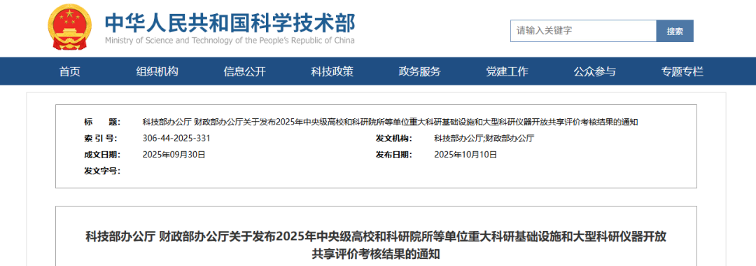1010日,科技部辦公廳、財政部辦公廳發布了《關于發布2025年中央級高校和科研院所等單位重大科研基礎設施和大型科研儀器開放共享評價考核結果的通知》。