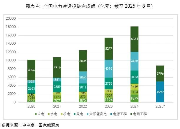 “十四五”我國電力建設投資保持快速增長,2020年突破1萬億元,2024年超1.8萬億元,20251-8月電源及電網投資同比均進一步增長。其中,火電投資增長速度同樣迅猛,從2020年的567億元,到2023年的1124億元已接近翻倍,再到2024年的1879億元又有67%的大幅增長。