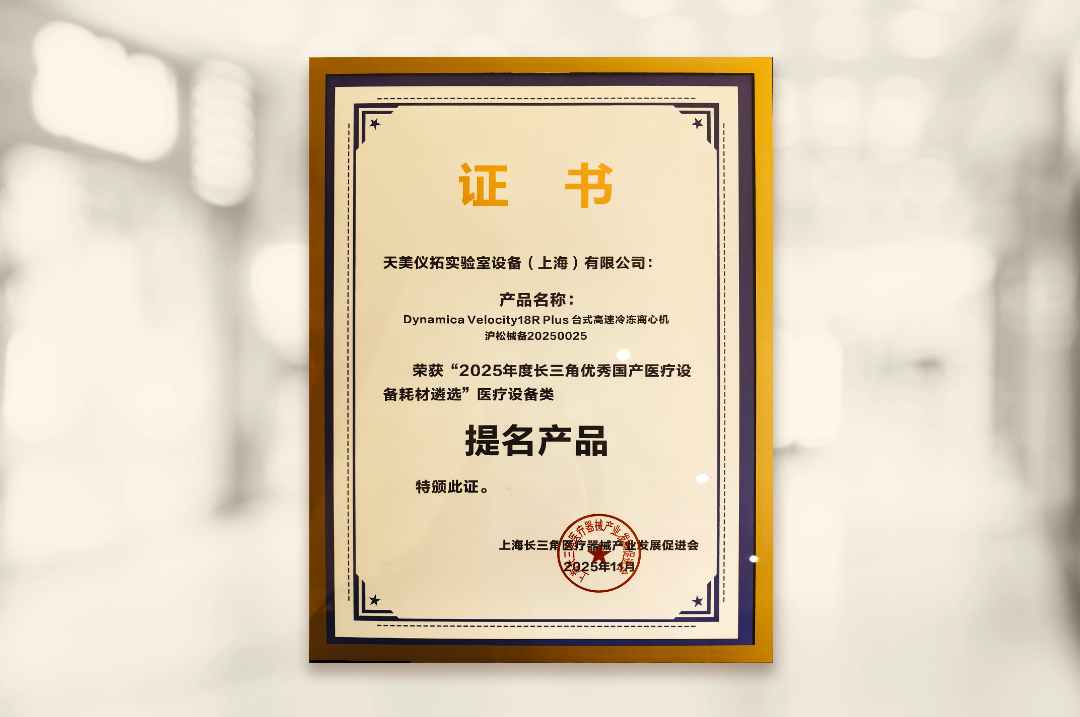 天美旗下Dynamica Velocity18R Plus臺式高速冷凍離心機從眾多國產設備中脫穎而出,榮獲“2025年度長三角優(yōu)秀國產醫(yī)療設備耗材遴選”醫(yī)療設備類提名產品。