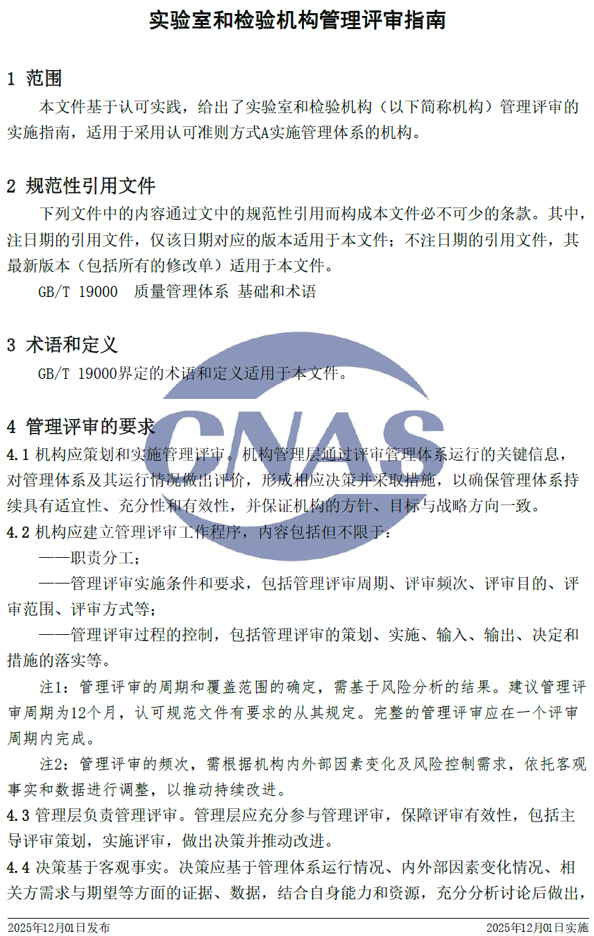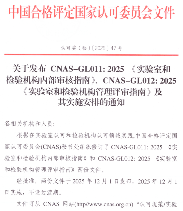 摘要:中國(guó)合格評(píng)定國(guó)家認(rèn)可委員會(huì)(CNAS)近日發(fā)布CNAS-GL011:2025 《實(shí)驗(yàn)室和檢驗(yàn)機(jī)構(gòu)內(nèi)部審核指南》和CNAS-GL012:2025 《實(shí)驗(yàn)室和檢驗(yàn)機(jī)構(gòu)管理評(píng)審指南》。兩份文件已于2025年12月1日正式實(shí)施。