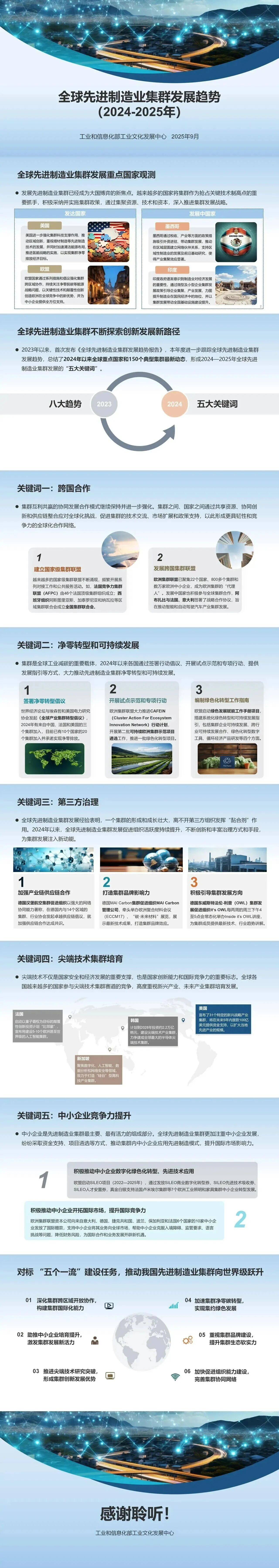 先進制造業(yè)集群是制造業(yè)高質(zhì)量發(fā)展的核心趨勢,也是制造強國戰(zhàn)略布局的關(guān)鍵重點,對推進新型工業(yè)化、保障產(chǎn)業(yè)鏈供應(yīng)鏈安全、構(gòu)筑大國經(jīng)濟安全屏障具有重要意義。黨中央、國務(wù)院高度重視其培育發(fā)展,習(xí)近平總書記作出系列重要指示,黨的二十屆三中全會也提出明確要求。在新一輪科技革命和產(chǎn)業(yè)變革深入演進、全球產(chǎn)業(yè)鏈供應(yīng)鏈加速重構(gòu)的背景下,課題組以全球 150 個典型集群為跟蹤樣本,延續(xù)往年研究基礎(chǔ),梳理 2024 年以來全球重點國家及集群最新動態(tài),提煉出五大年度關(guān)鍵詞,并形成我國集群培育提升的相關(guān)建議,為政府、相關(guān)組織及企業(yè)提供參考。