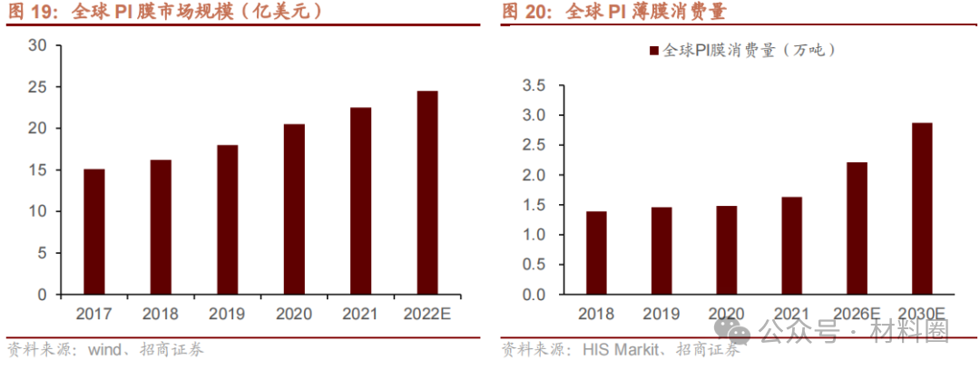 聚酰亞胺薄膜(PI 膜)是最早進入商業流通且用量最大的PI材料。2021年,全球PI薄膜消費量1.63萬噸,預計到2030年將達到2.9萬噸,年均復合增長率達6.5%,全球PI薄膜市場規模22.5億美元。