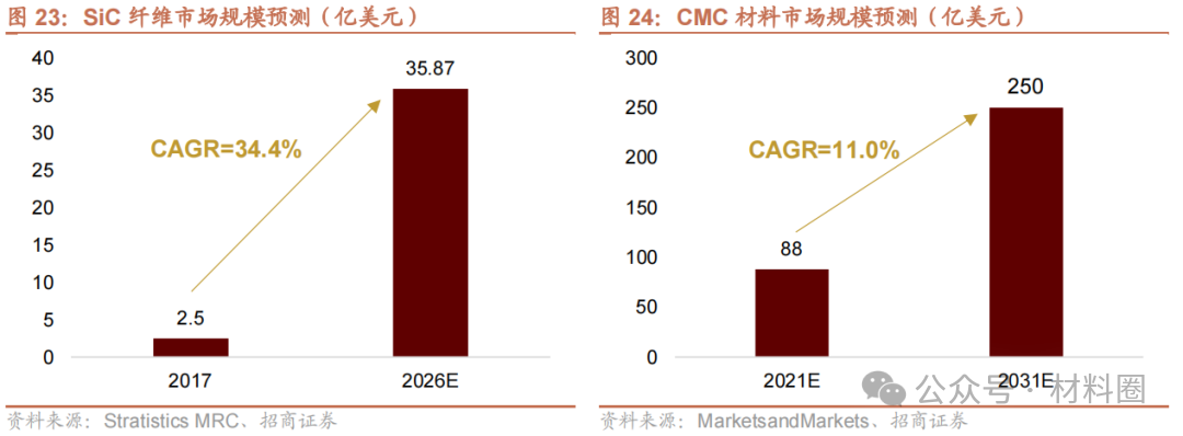 預計未來各國對航空航天領域的投入加大,推動SiC纖維規模高速增長。根據Stratistics MRC預測,2026SiC纖維的市場規模將增長至35.87億美元,2017~2026年間復合年增長率將達到34.4%SiC纖維下游最主要的應用之一是SiC纖維復合陶瓷基材料(CMC材料),未來十年,伴隨著綜合國力的增強以及國際形勢的不確定性,以中國為代表的主要發展中國家有望加大航空航天領域的投入力度。在此背景下,憑借輕量化、高耐熱、抗氧化的顯著優勢,CMC材料的使用率有望大幅增長。根據MarketsandMarkets預測,到2031年,全球CMC材料市場規模將達到250億美元,2021~2031年間復合年增長率將達到11.0%