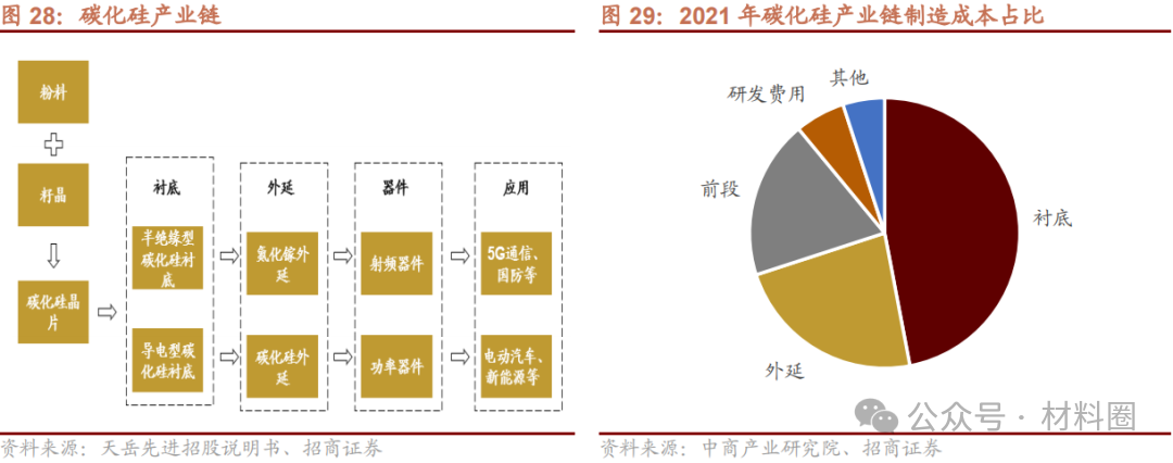 碳化硅生產過程分為單晶生長、外延層生長及器件制造三大步驟,對應的是產業鏈襯底、外延、器件與模組三大環節。其中,襯底和外延占據主要價值,在產業鏈中的成本占比分別為47%23%。