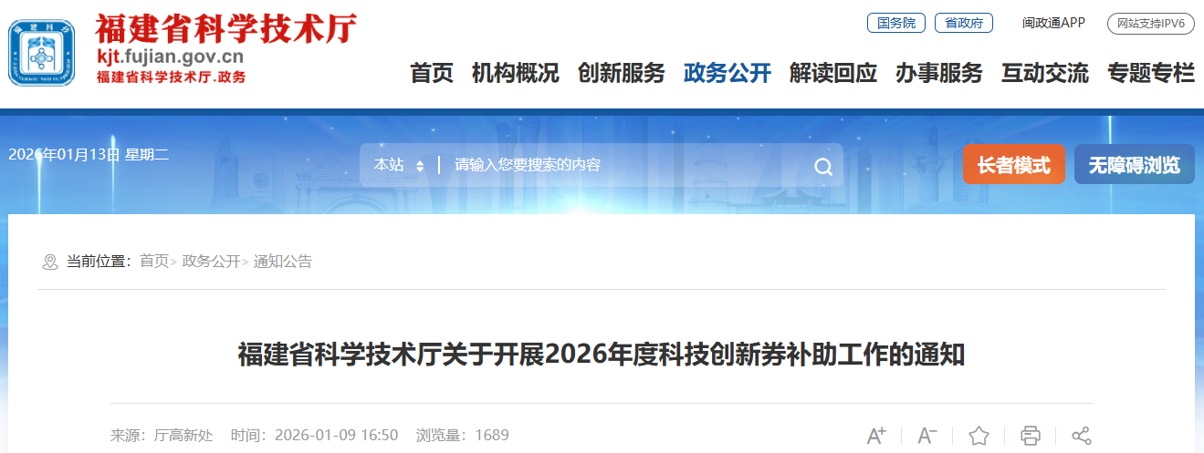 福建省科學技術廳關于開展2026年度科技創新券補助工作的通知