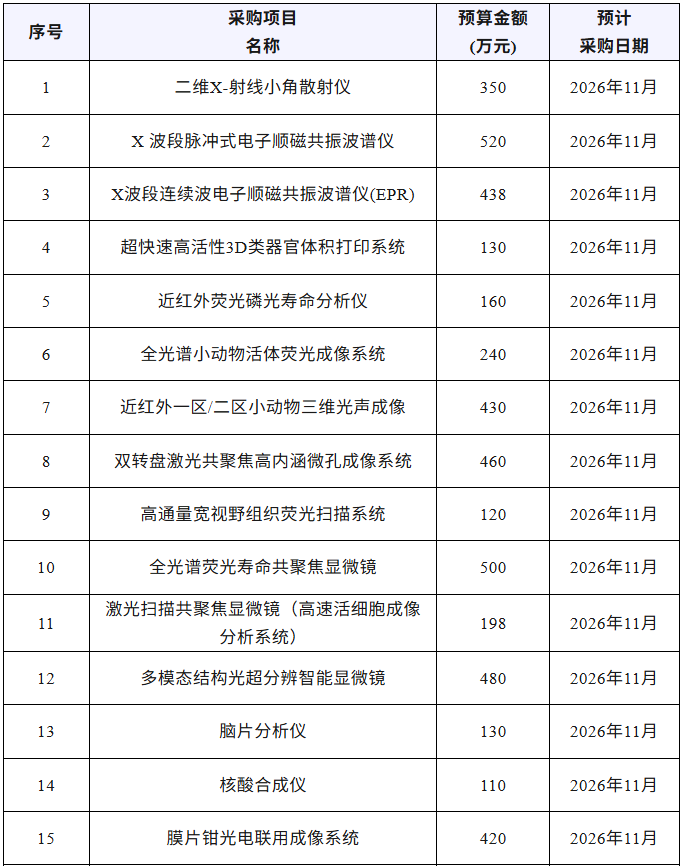 近期,湖南大學(xué)發(fā)布多項儀器采購項目,擬采購二維X-射線小角散射儀、X 波段脈沖式電子順磁共振波譜儀、全光譜熒光壽命共聚焦顯微鏡、核酸合成儀、場發(fā)射透射電子顯微鏡、電感耦合等離子體質(zhì)譜儀、超高分辨液相色譜質(zhì)譜聯(lián)用儀等儀器設(shè)備,預(yù)算總金額13641.8萬元,預(yù)計采購時間2026年1月~11月。