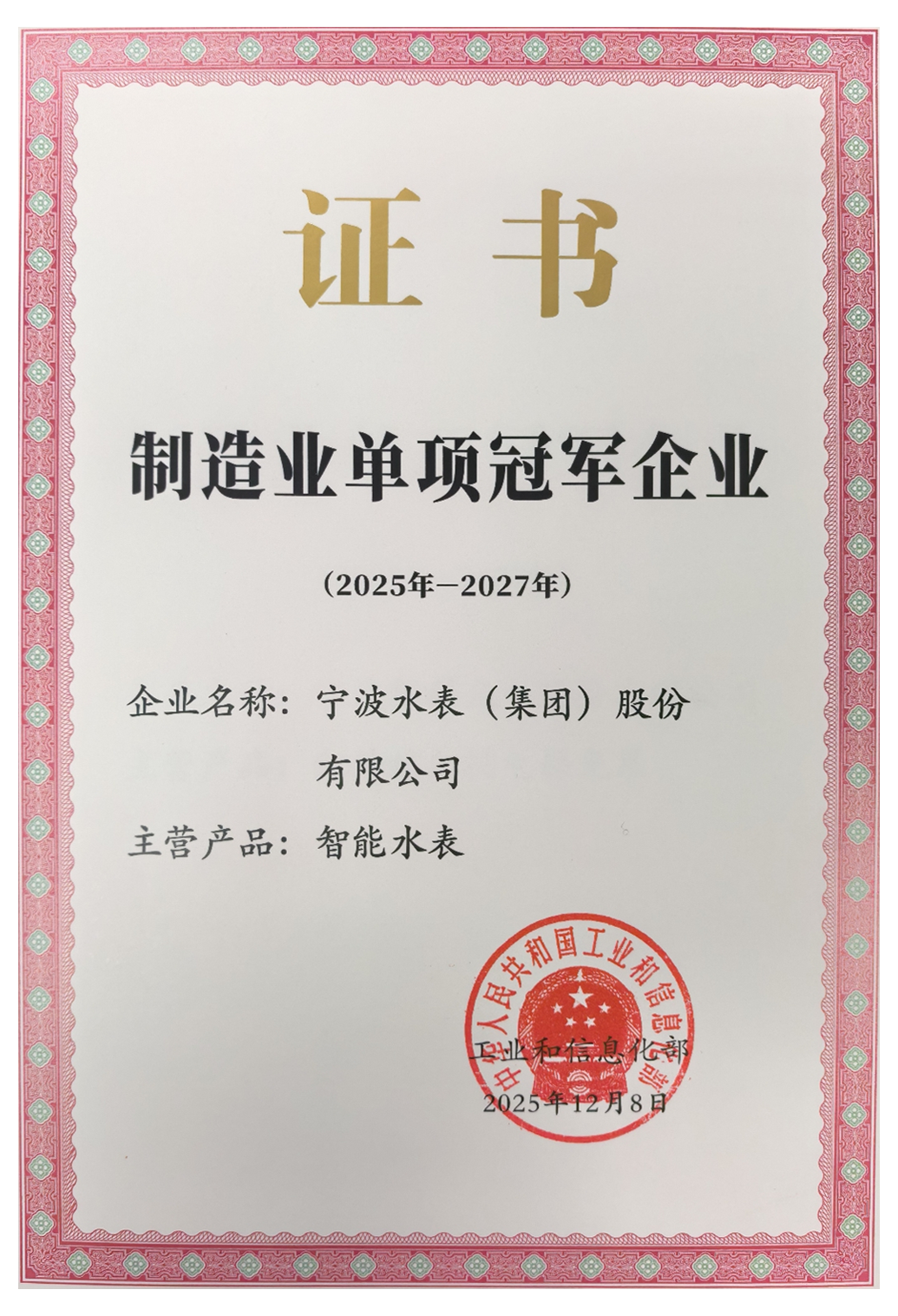 近日,工業(yè)和信息化部正式公布制造業(yè)單項冠軍企業(yè)復核通過名單,寧波水表(集團)股份有限公司(以下簡稱“寧水集團”)再次榮膺國家級制造業(yè)單項冠軍企業(yè)稱號,成為行業(yè)內唯一蟬聯該國家級榮譽的標桿企業(yè)。此次復核成功,不僅是對寧水集團在智能水計量領域全球領先地位的權威認證,更是對企業(yè)構建并持續(xù)深化技術、制造與品牌全方位核心競爭力的國家級認可。
