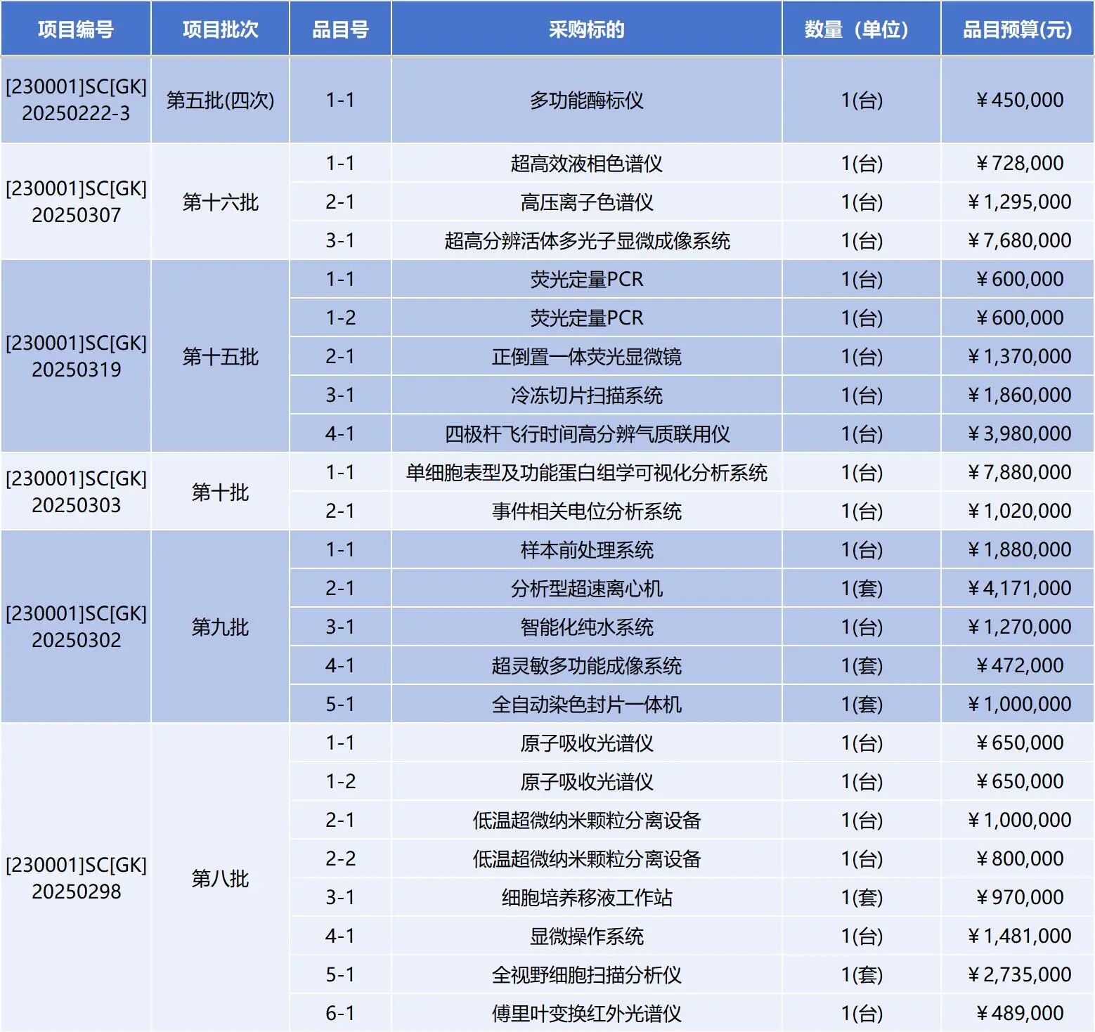 據統計,本次計劃采購的儀器設備總預計招標金額超過8200萬元,涵蓋四極桿飛行時間高分辨氣質聯用儀、高效液相色譜儀、研究級倒置熒光顯微鏡、倒置多功能熒光成像系統、熒光定量PCR儀、高壓離子色譜儀、多功能酶標儀、傅里葉變換紅外光譜儀、原子吸收光譜儀、超靈敏化學發光成像儀、超高頻高分辨率小動物超聲成像系統、小動物活體三維成像系統、超靈敏多功能成像系統、單細胞表型及功能蛋白組學可視化分析系統等共計40項高端科研設備。