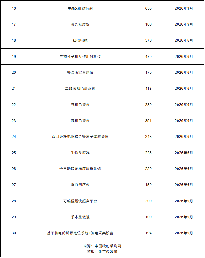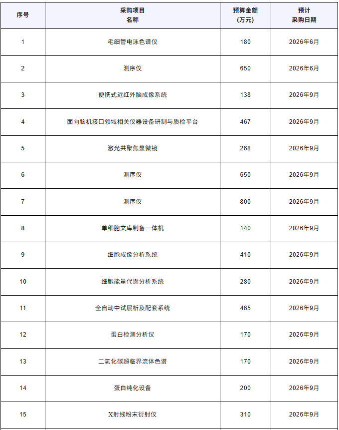 近日,南京醫(yī)科大學(xué)發(fā)布2026年2月(第2批)政府采購意向公告,計(jì)劃采購毛細(xì)管電泳色譜儀、測序儀、便攜式近紅外腦成像系統(tǒng)、激光共聚焦顯微鏡、蛋白檢測分析儀、X射線粉末衍射儀等儀器設(shè)備,總預(yù)算9364萬元,預(yù)計(jì)采購時間2026年6月~9月。