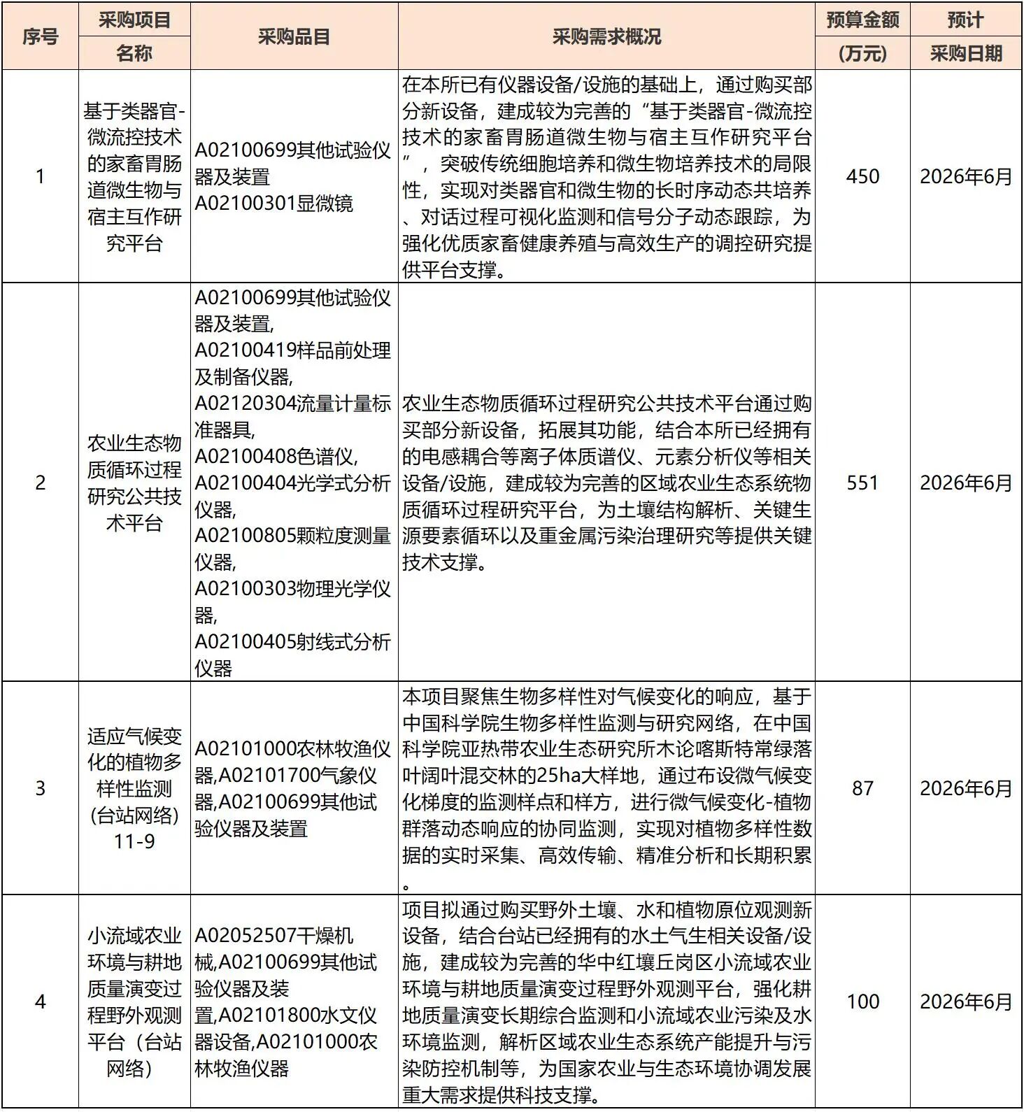 近日,中國(guó)科學(xué)院亞熱帶農(nóng)業(yè)生態(tài)研究所發(fā)布2026年3至12月政府采購(gòu)意向,計(jì)劃投入超千萬(wàn)元集中采購(gòu)一批尖端科研儀器設(shè)備。本次采購(gòu)項(xiàng)目包括基于類器官-微流控技術(shù)的家畜胃腸道微生物與宿主互作研究平臺(tái)、農(nóng)業(yè)生態(tài)物質(zhì)循環(huán)過(guò)程研究公共技術(shù)平臺(tái),植物多樣性監(jiān)測(cè)儀器和小流域環(huán)境觀測(cè)平臺(tái)相關(guān)設(shè)備。